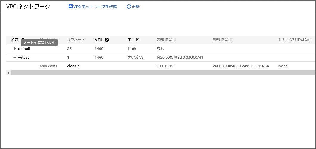 - VPCネットワークULAの内部IPv6範囲:有効