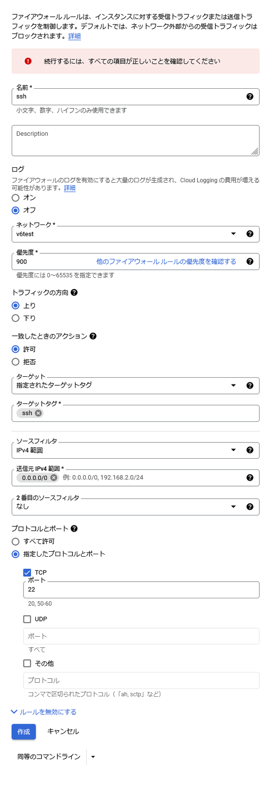 インスタンスを作成したのですが、SSHでログインできないと思います。GCEのネットワークの設定を変えていきます