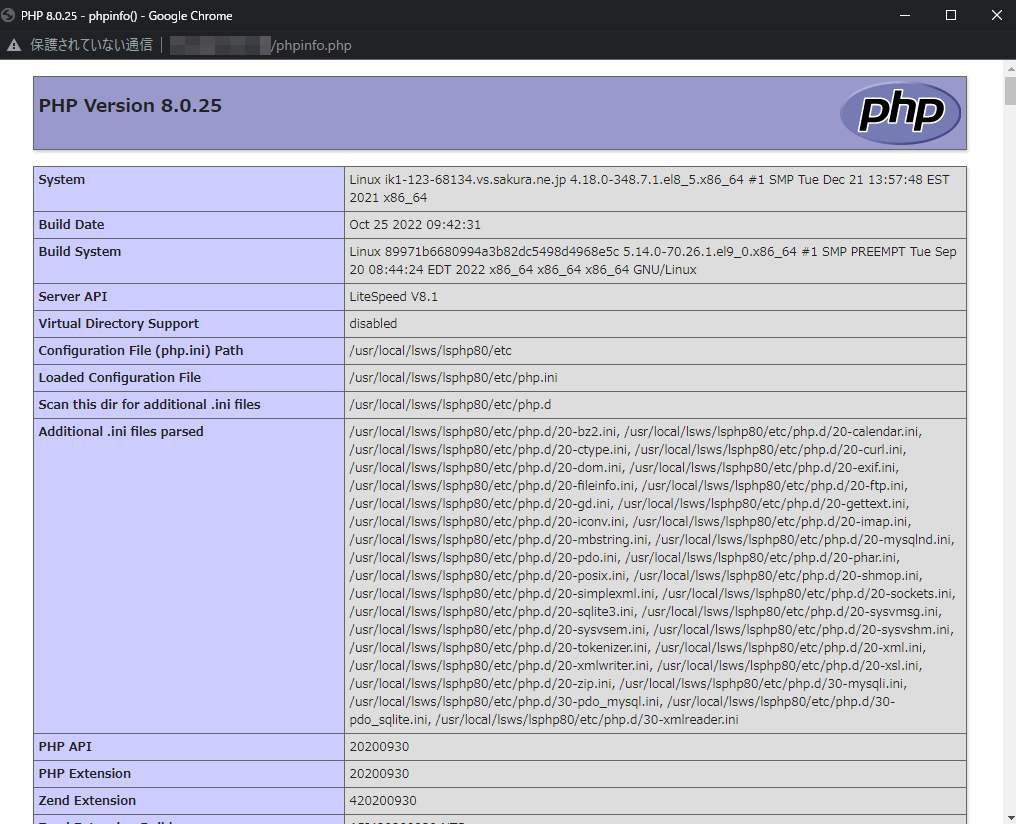 でopenlitespeedの画面が表示されるので、Test PHPを表示します。8.0.25になっていればOKです