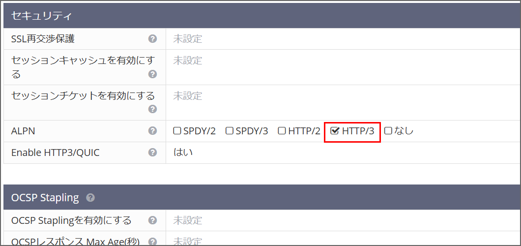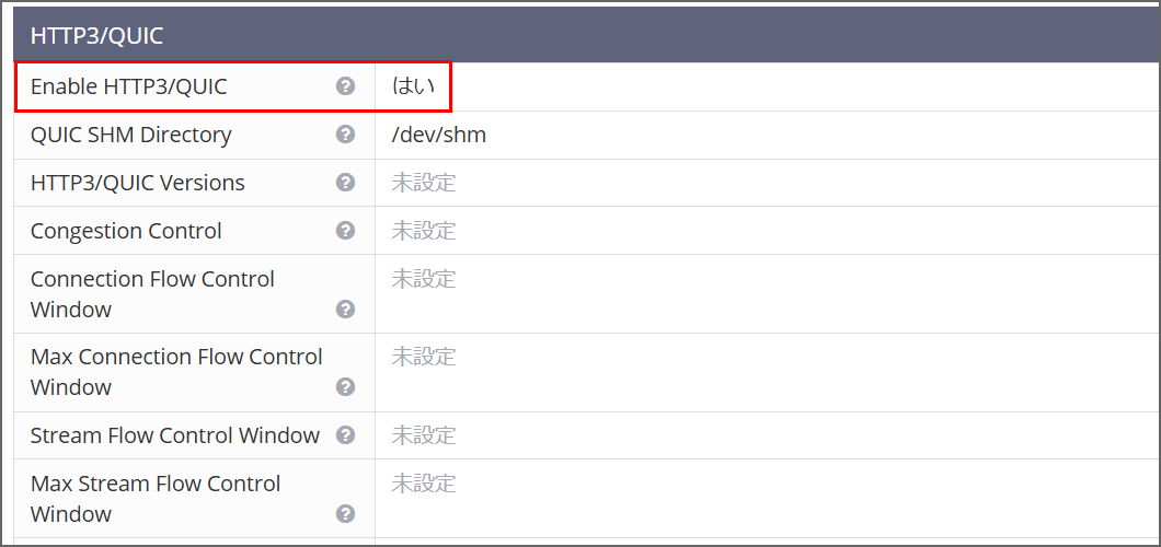 セキュリティー > Enable HTTP3/QUIC の箇所をはいに設定します
