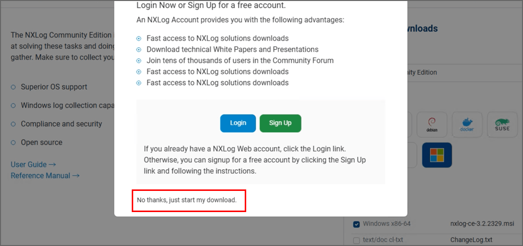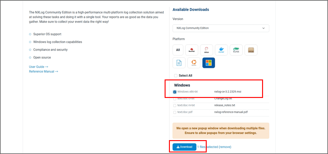 最新版の.msiファイル(例:nxlog-ce-3.2.2329.msi)にチェックを入れ、「Download」ボタンをクリックします。
