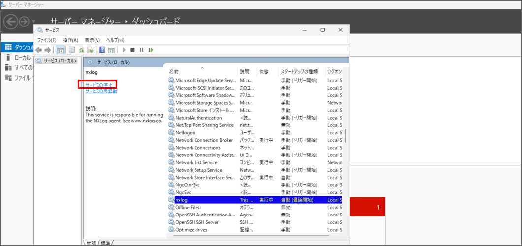 サービス一覧から「nxlog」を探し「停止」を選択します。