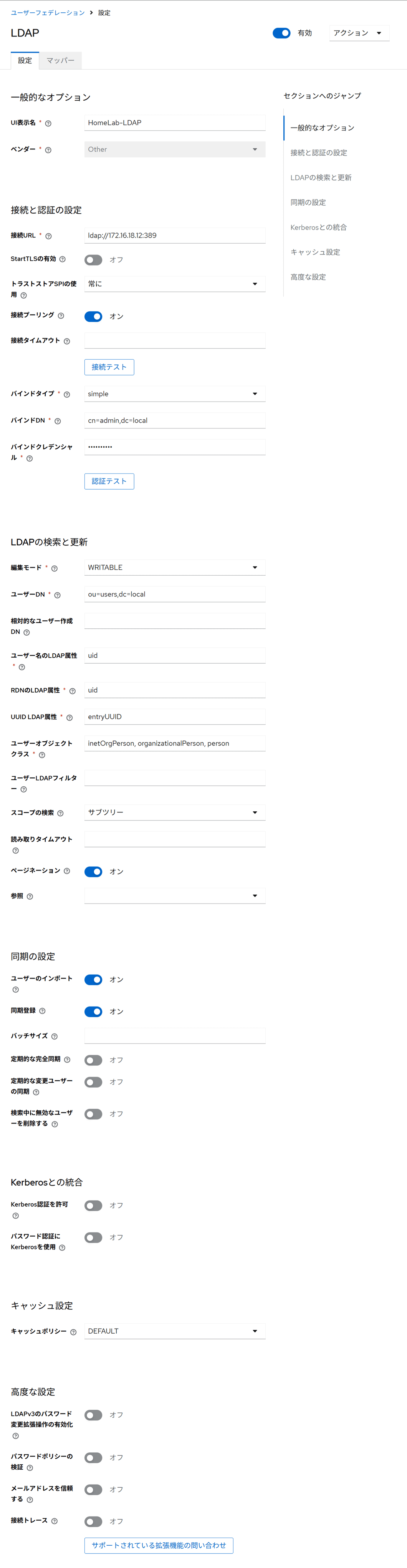 cn=admin,dc=local - バインドクレデンシャル: