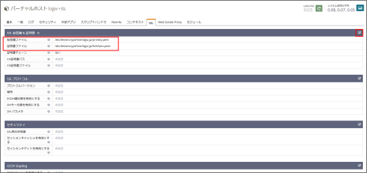 SSLタブに移動をして秘密鍵と証明書ファイルを設定します