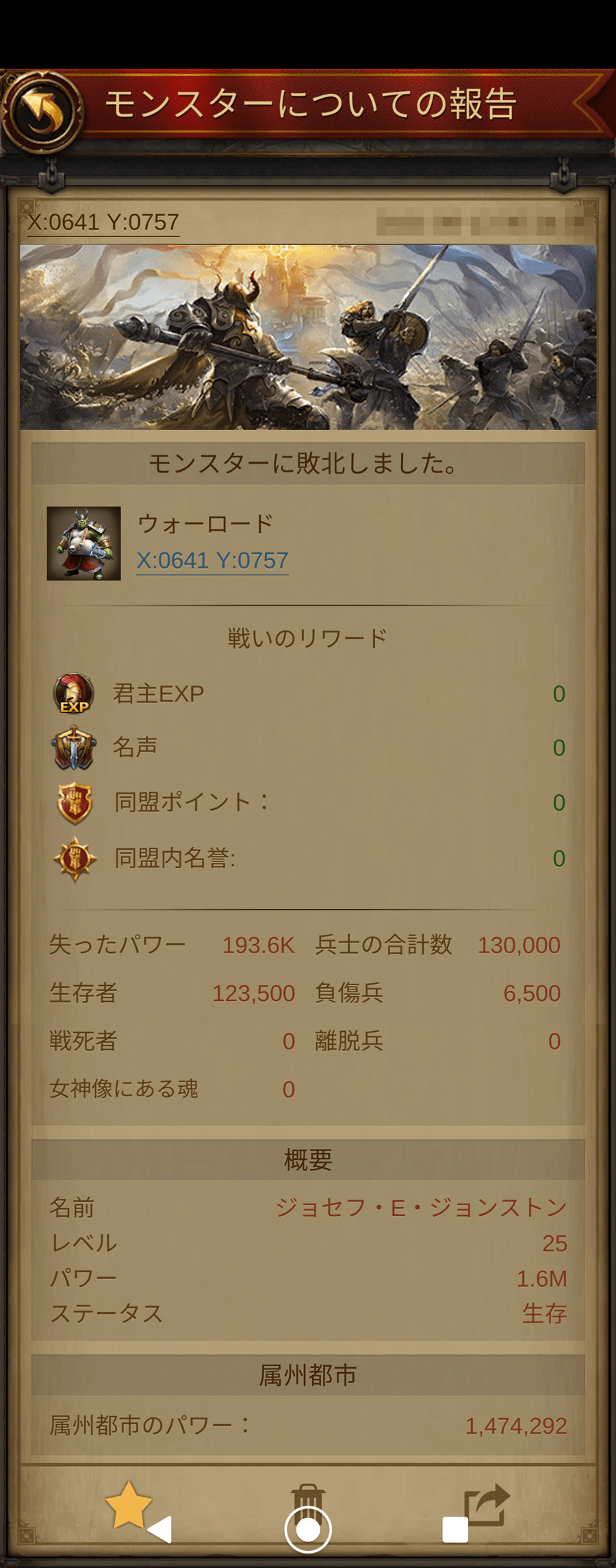 レベル25から記録を残すエボニーです。今回はボスLv1ウォーロードにチャレンジしてみます。兵レベル10で13万人用意しました。結果はどうなるでしょうか