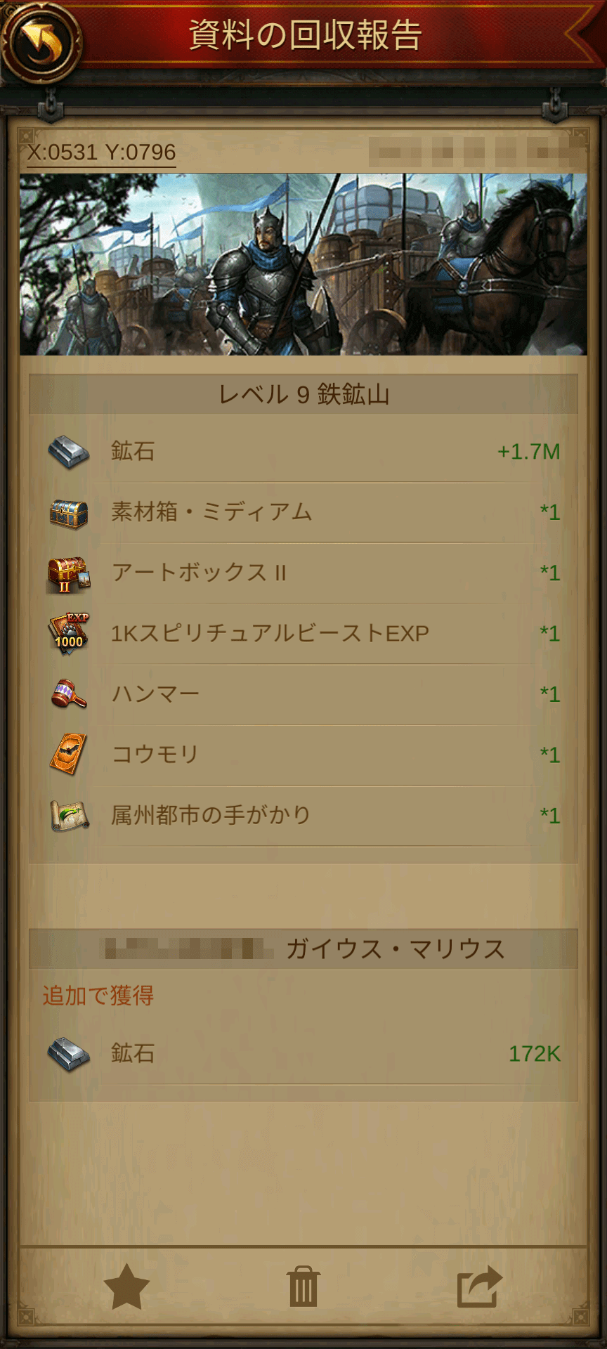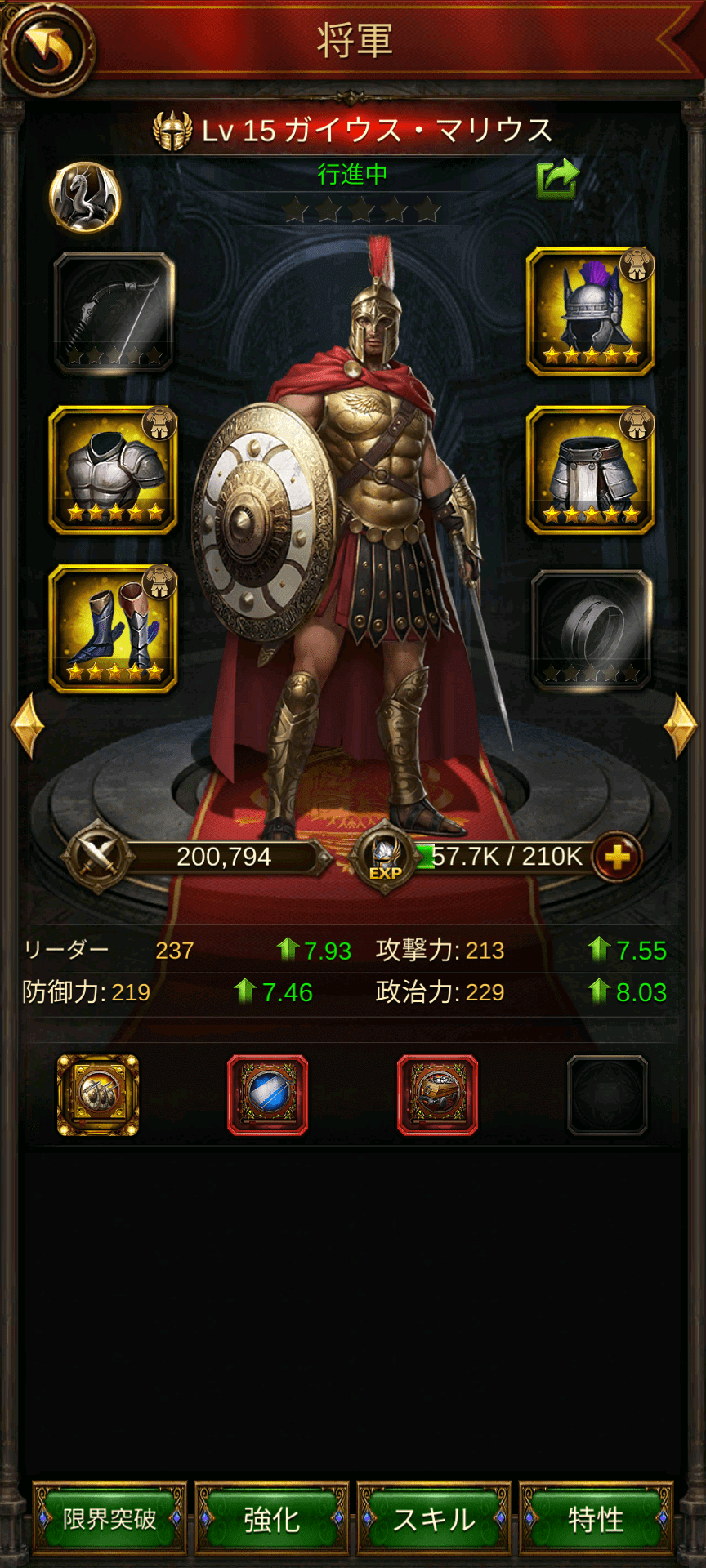 ガイウス・マリウスのスキルは「マリウスの軍制改革」となってます。このスキルを持つ将軍が部隊を率いている場合、マップ上の資源拠点での鉱石の回収速度が30%、木材と石材の回収速度が15%アップするというスキルになります