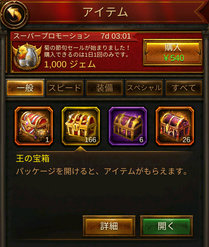 長期イベントの王の花道でクエストをクリアすると貰える宝箱です。10スタミナが1つ必ず入ってます