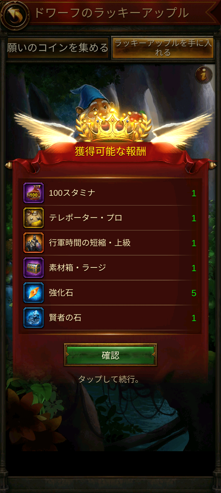 長期イベントのドワーフのラッキーアップルで手に入ります。確実にではなく、運がとければ手に入ります。個人的には日本時間の昼間に試すと高確率でスタミナ100が手に入ります