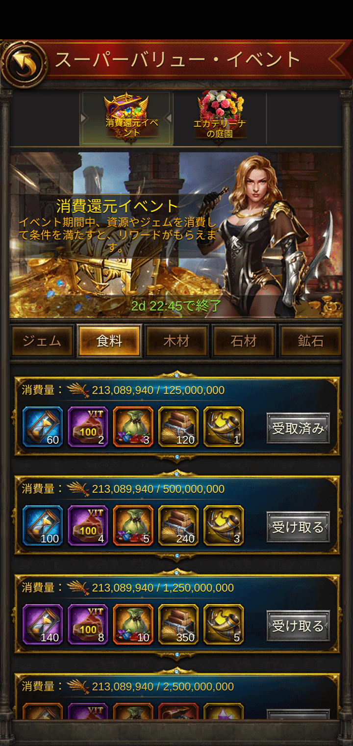 消費還元イベントの資源を大量に使うイベントの時にスタミナが手に入ります。画像は食糧ですが、木材〜鉱石まで同じように手に入ります