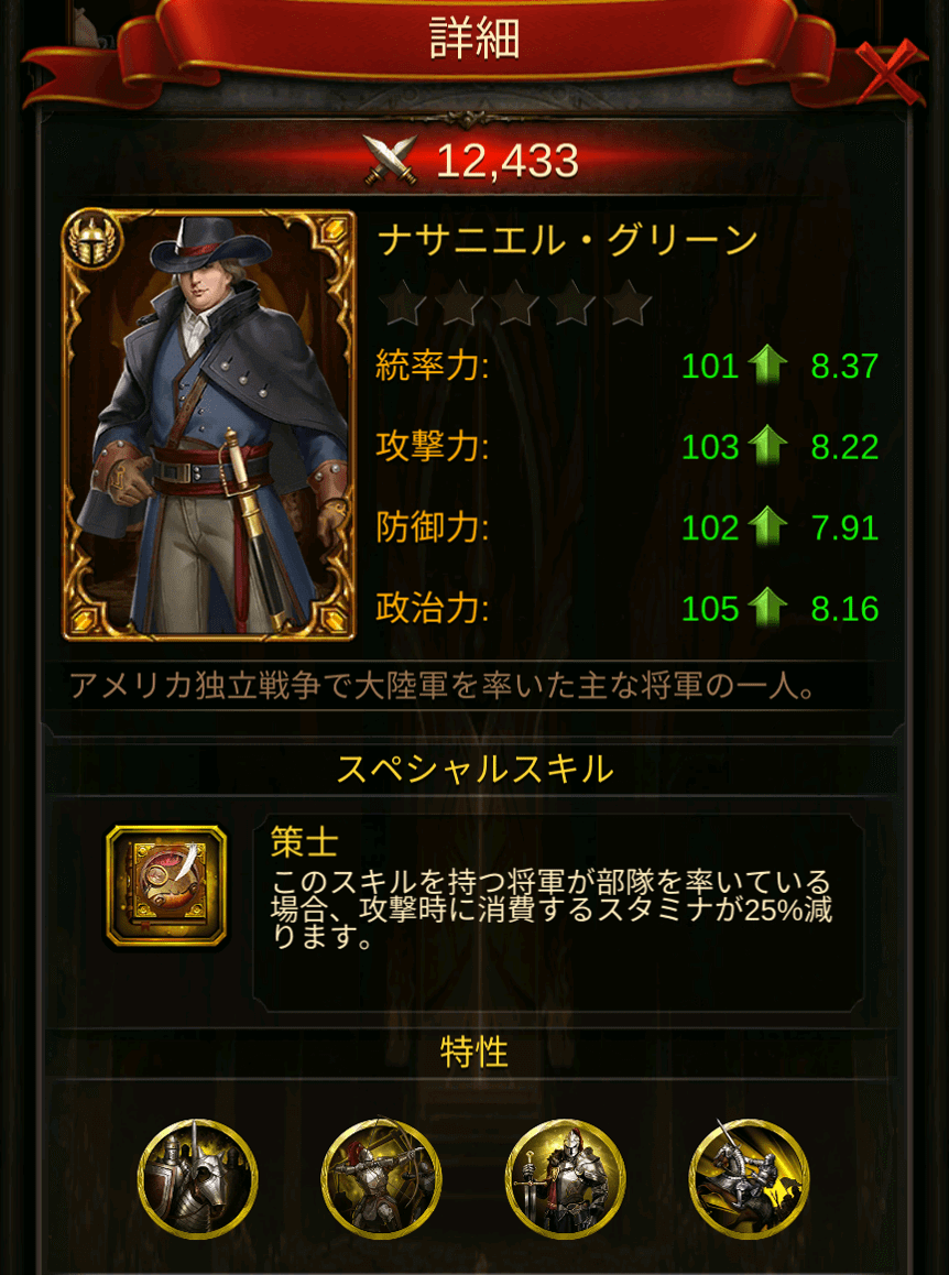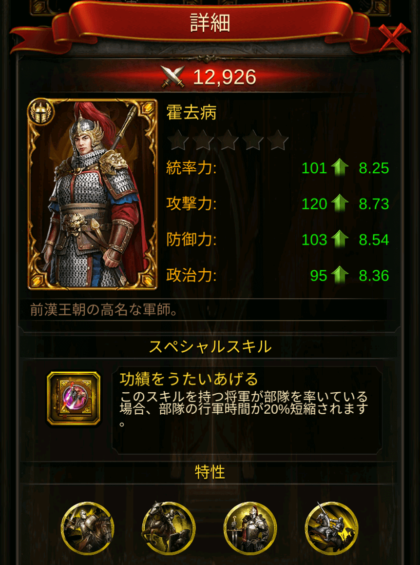 - スキル:功績をうたいあげる/軍を率いている場合、部隊の行軍時間が20%短縮されます。