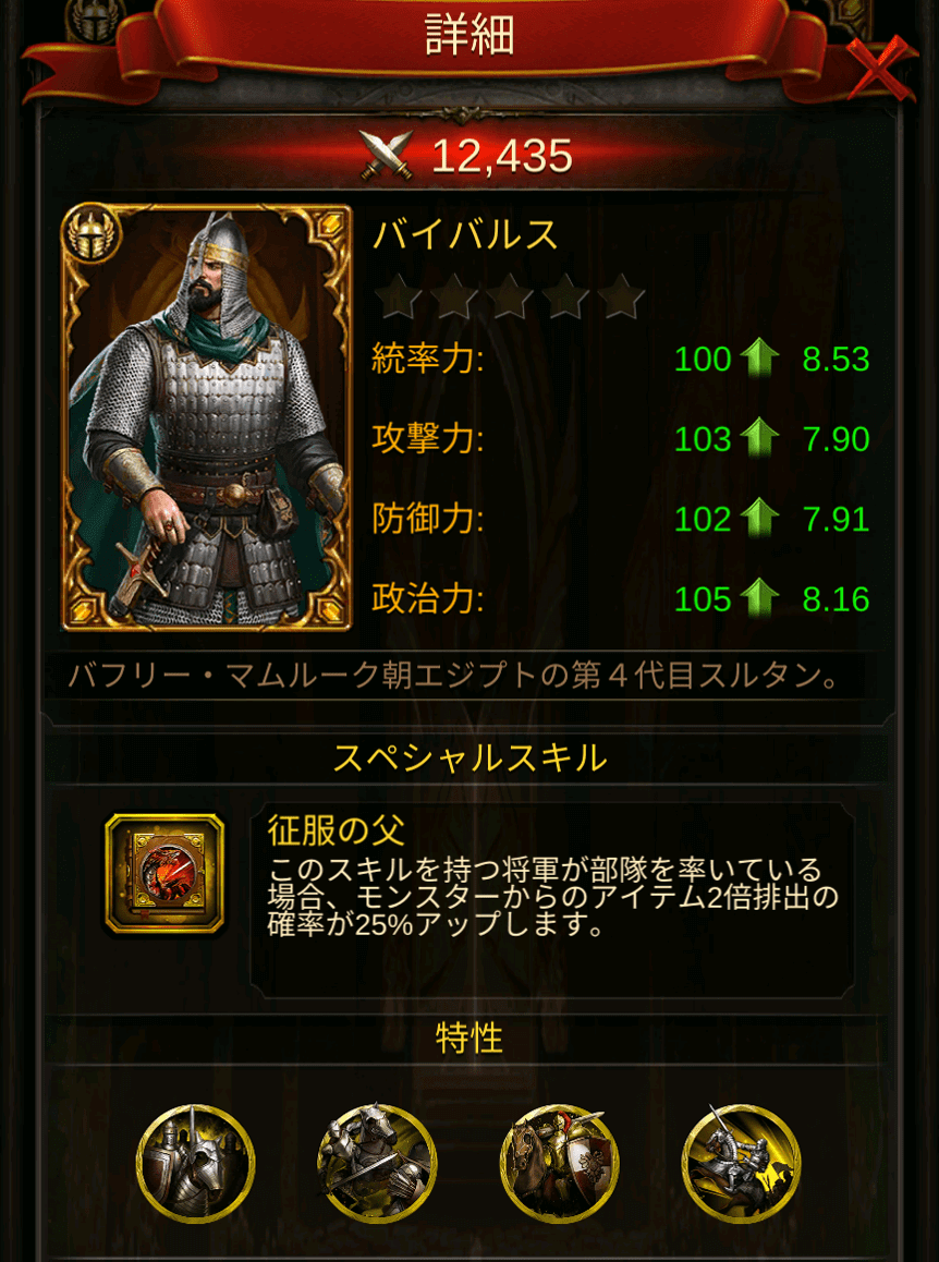 - スキル:征服の父/部隊を率いている場合、モンスターからのダブルドロップ率が25%になります。