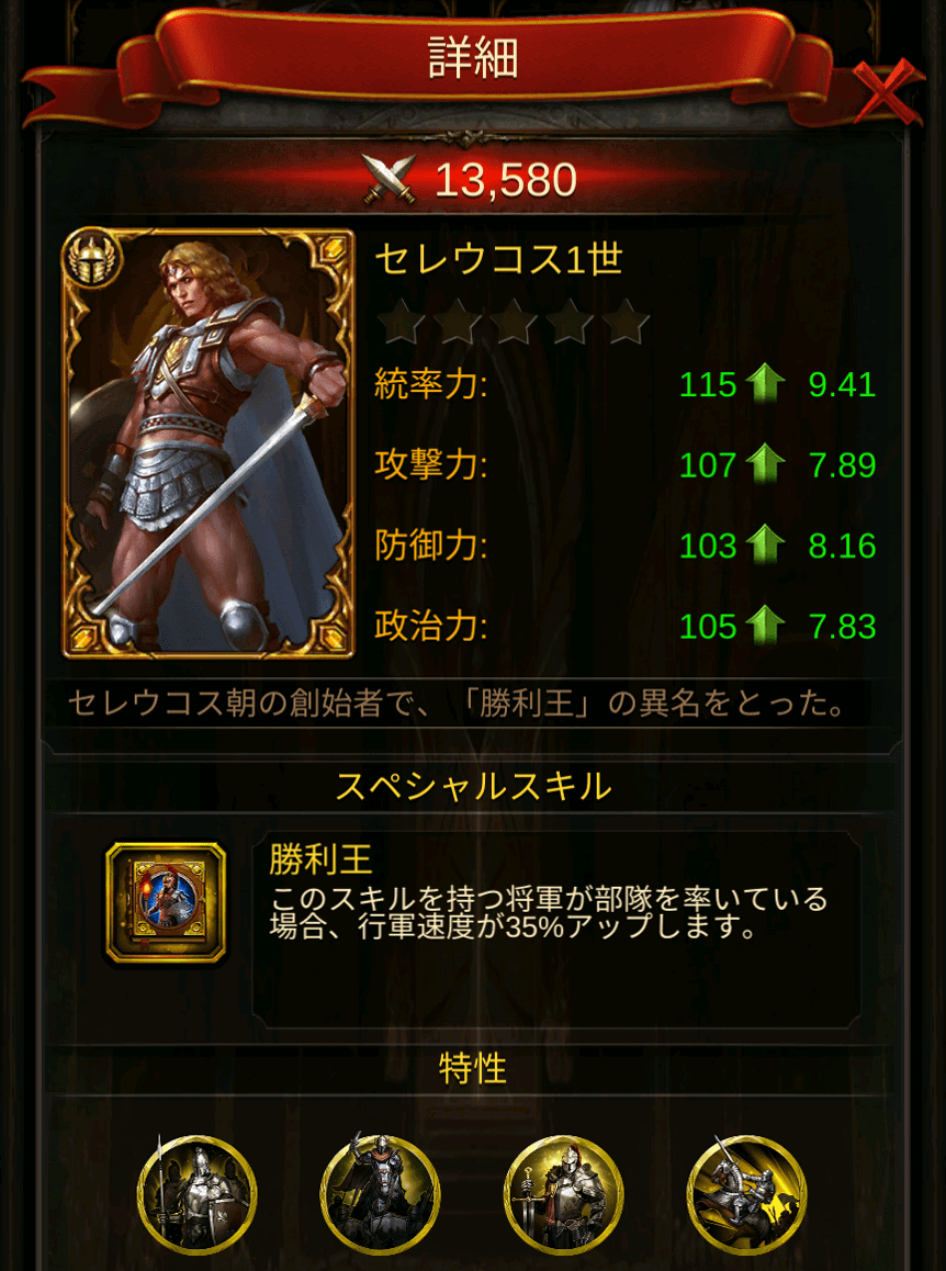 - スキル:勝利王/部隊を率いている場合、行軍速度が35%上がります。