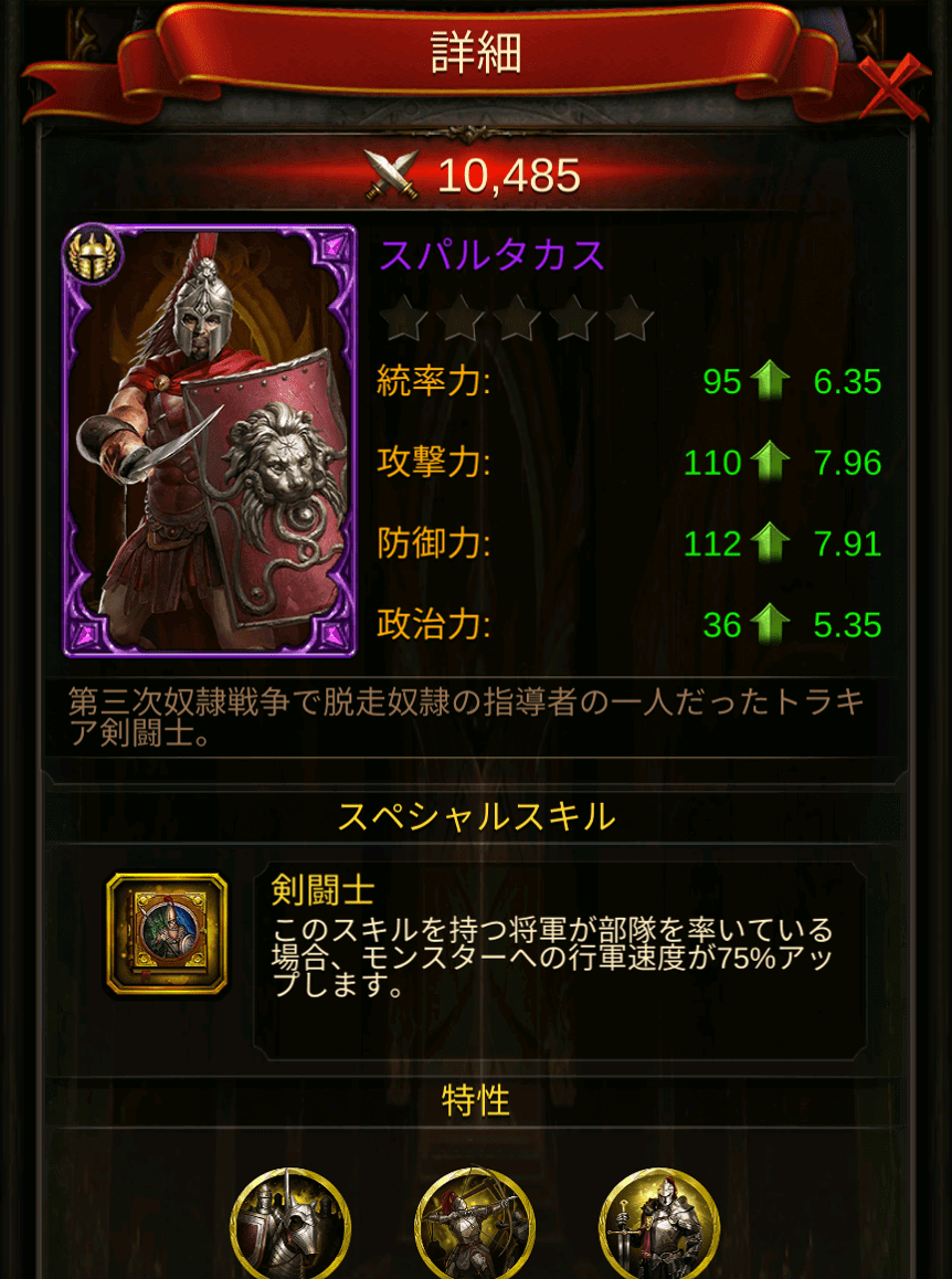 - スキル:剣闘士/部隊を率いている場合、モンスターへの行軍速度が75%上がります。