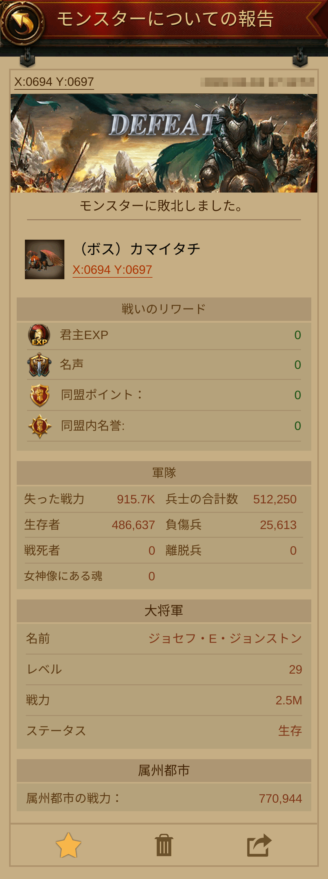 結果としては敗北です。モンスター狩り用ではないジョセフ・E・ジョンストンでは限界があるのかなと思いました。ローランやワシントンのように騎兵の攻撃力があがったりする将軍で攻めた方が実はいいのかなと思い始めました。
