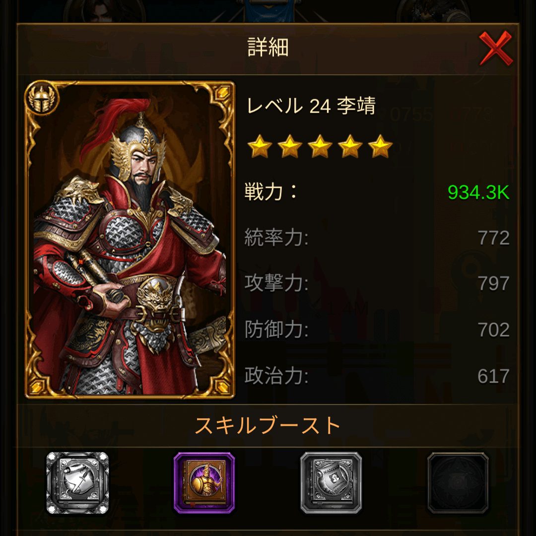 - スキル:栄光の騎士/このスキルを持つ将軍が攻撃を率いている場合、騎兵の攻撃力が30%、防御力とHPが15%アップします。