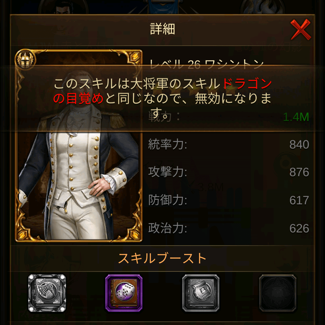 全然スキル違うのに・・・被っているとでます。なぜ被っているのかわからないので他の将軍をつけてみたいと思います