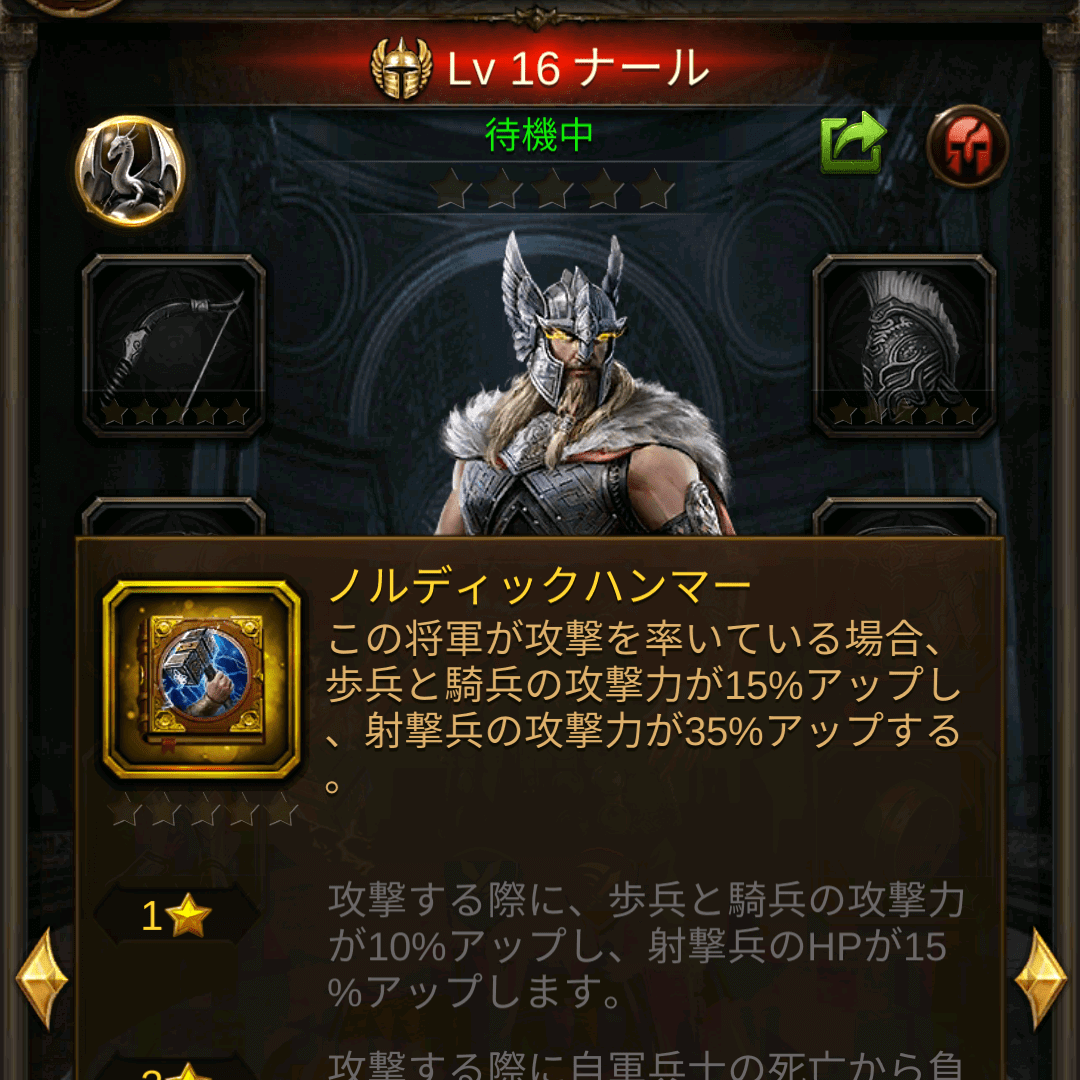 - スキル:ノルディックハンマー/この将軍が攻撃を率いている場合、歩兵と騎兵の攻撃力が15%アップし、射撃兵の攻撃力が35%アップする