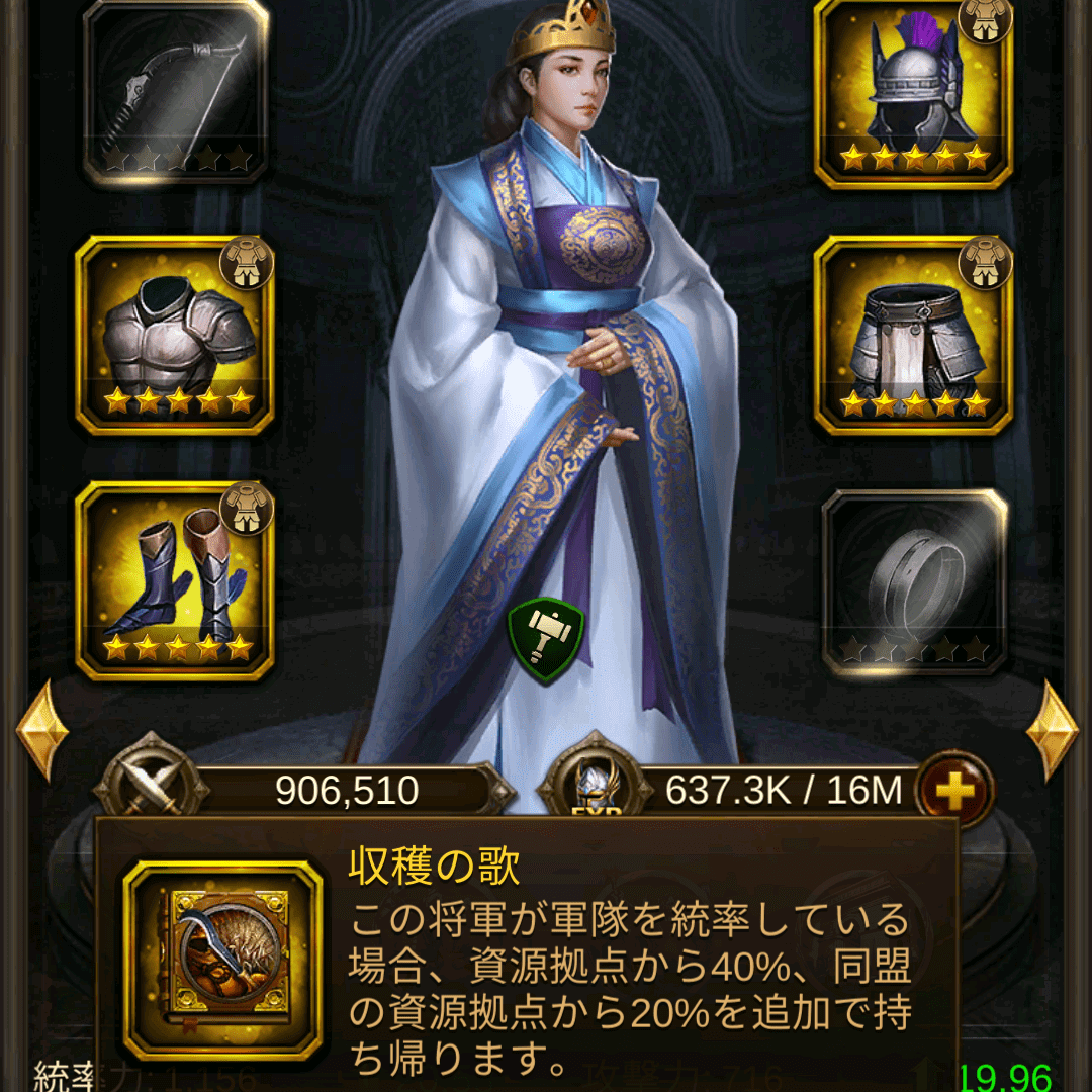 - スキル:収穫の歌/この将軍が軍隊を統率している場合、資源拠点から40%、同盟の資源拠点から20%を塚で持ち帰ります。