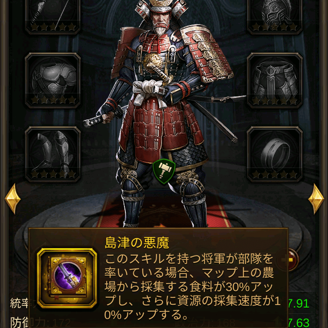 - スキル:島津の悪魔/このスキルをもつ将軍が部隊を率いている場合、マップの農場から採集する食料が30%アップし、さらに資源の採集速度が10%アップする
