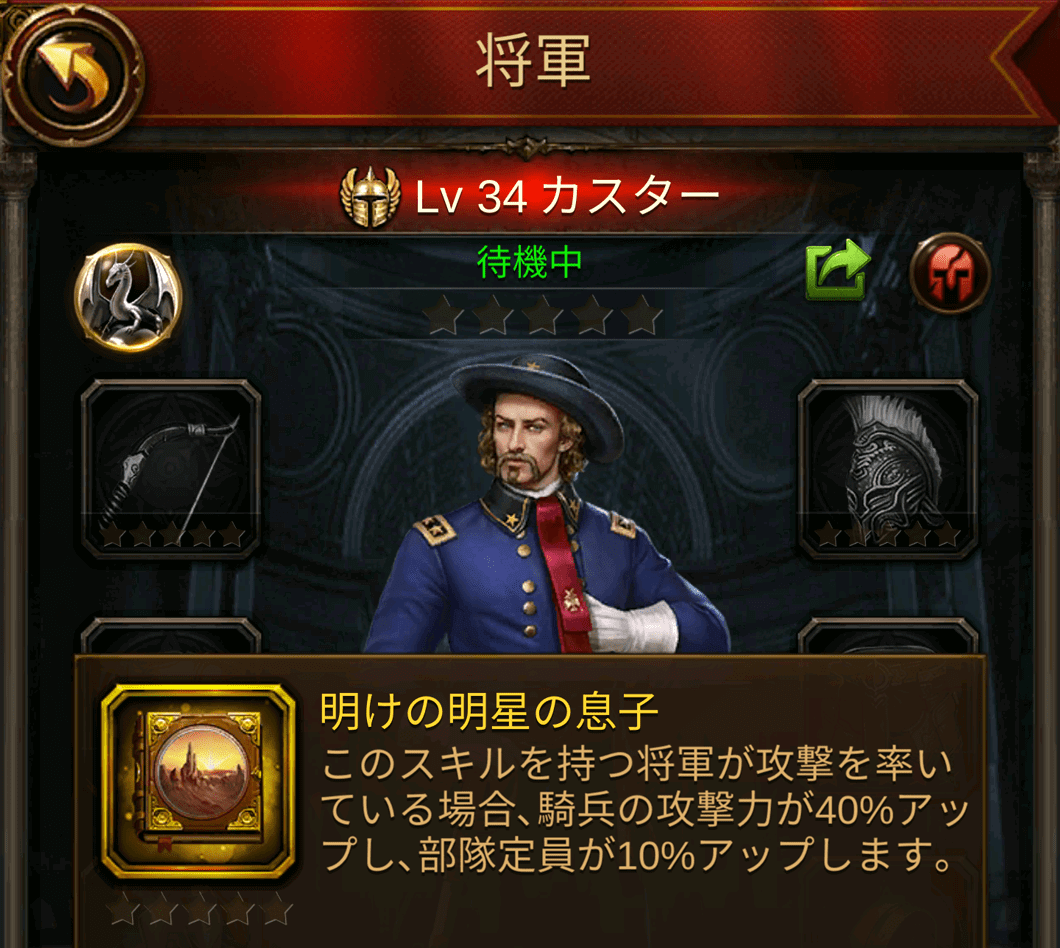 - スキル:明けの明星の息子/このスキルを持つ将軍が攻撃を率いている場合、騎兵の攻撃力が40%アップし、部隊定員が10%アップします