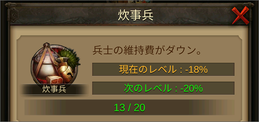 城のレベルがあがるほど、多くの資源を必要になります。兵士維持費が少ない方が食料の消費も少なくよいかもしれませんが、言い換えればそれは城のレベルがあがればあがるほどレベルアップの難易度があがります。食料は維持費の数値になるまでずっと兵士が食らい続けます。