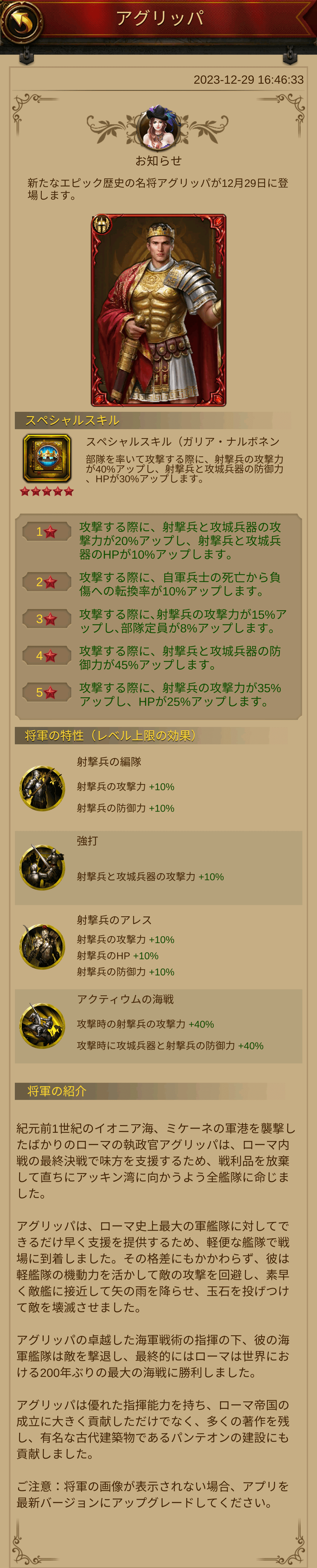 レベル25から記録を残すエボニーです。2023年12月29日に新しい将軍としてアグリッパが登場しました。今回はその紹介です