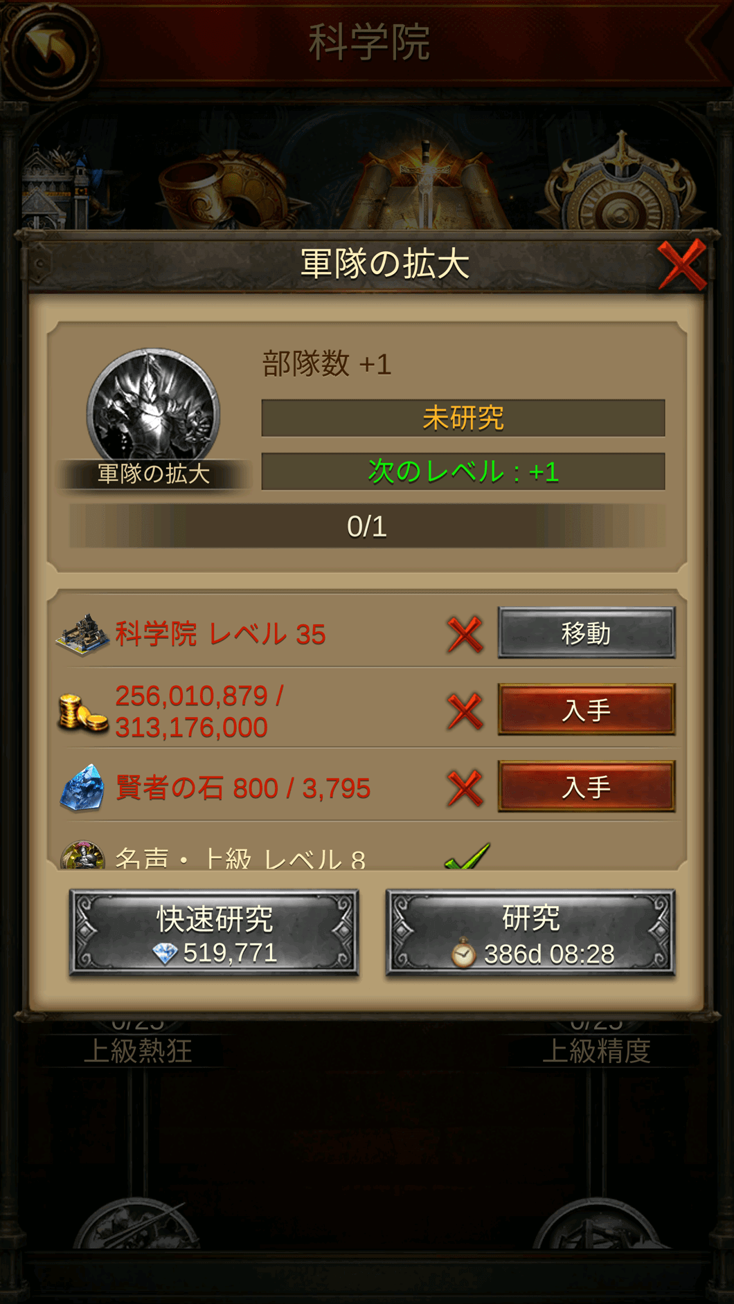 賢者の石が3,795個必要となります。部隊数を例にしてますが、研究の軍事力昇進のとこは他の研究でも賢者の石がいるため、かなりの数を消費をします。一つの研究で200個近く消費することもあります。