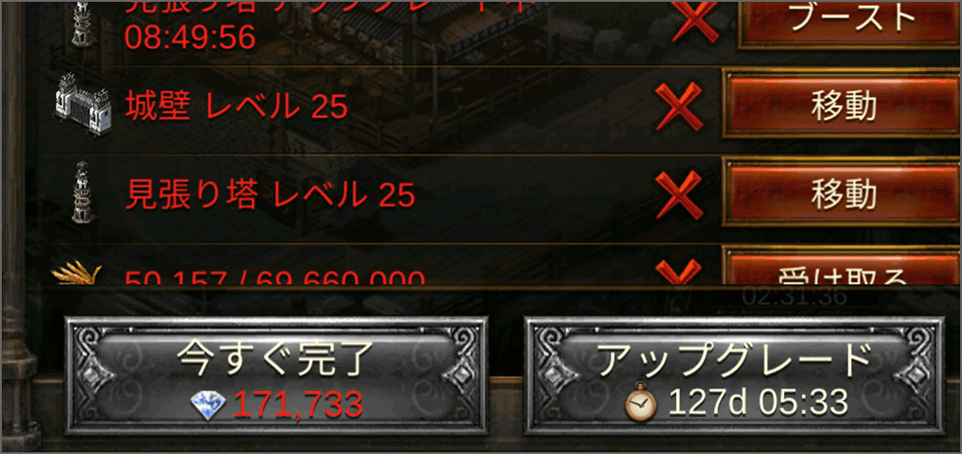 現時点で僕は見張りの塔は16レベルですが、17へのアップグレードに約1日ほどかかります。城壁をアップグレードしながら気長にやっていきましょう