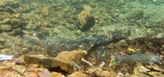 ↑放流してもらった直後です。実は一匹ヤマメがいました。そして手前の魚は死んだふりしていました。