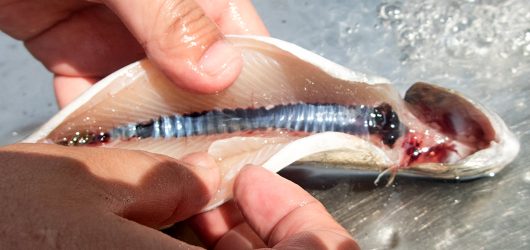 ↑内蔵処理しました。黒いのは血合いで、臭みとか鮮度が落ちる原因になるので親指で擦ったりして落とします。