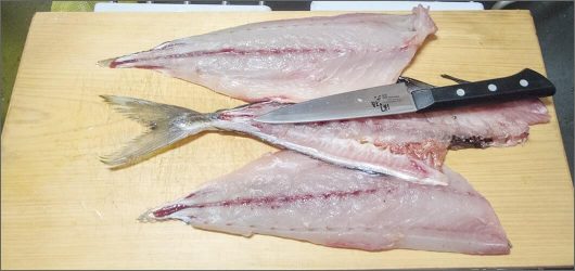 刺身は皮をはいだ後、アニサキス対策で飾り包丁をいれております。半身をそのまま使っているので血合いの箇所は骨抜きで骨を取っております。