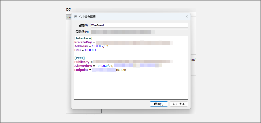 PrivateKey = <クライアントの秘密鍵(自動生成)>