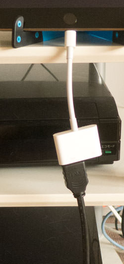 iPadをテレビに繫いでいると充電はできません。そこでこのケーブルは右側にライトニングケーブルを挿すことで充電しながらテレビへの出力ができます。