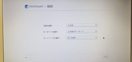 chrome OSは、インターネットに接続しているのが前提となります。そのため、インターネットにつながっていないとこれより先の設定にすすめません。