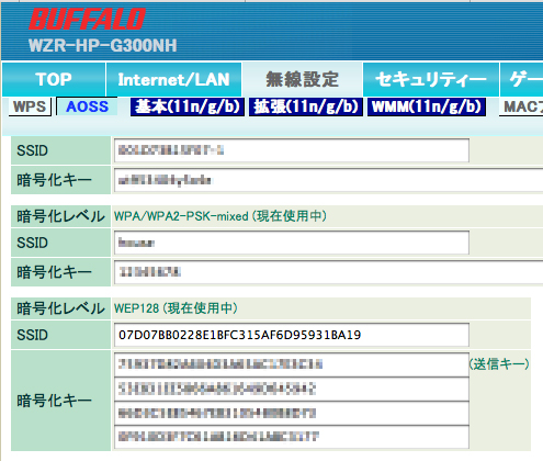普段家ではデスクトップは有線LANですが、MBAなどは無線LANを使用しています。初期設定でAOSSのボタン押せば自動で認識しますがその機能を使っていないため、僕はパスワードを自分で設定していました。