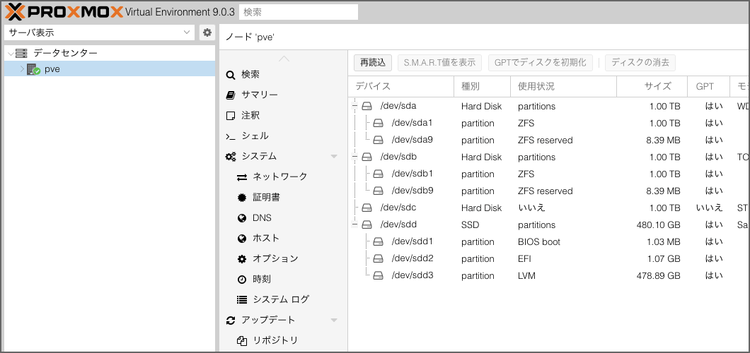 設定方法:HDDをProxmoxに認識させる