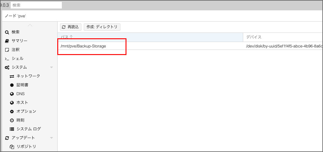 物理的にHDDを接続し、Proxmoxが起動している状態で管理画面にログインします。