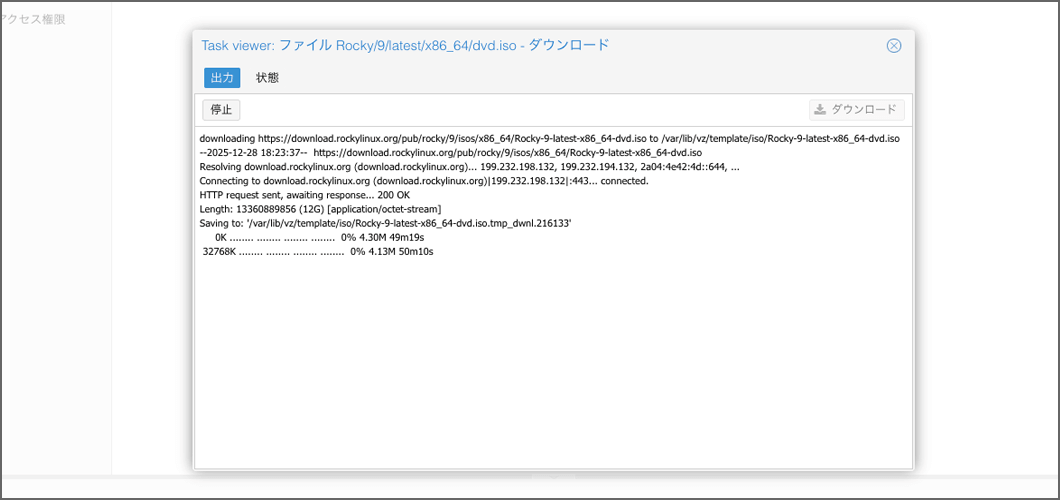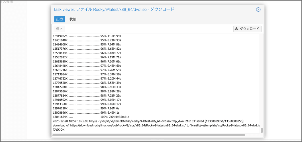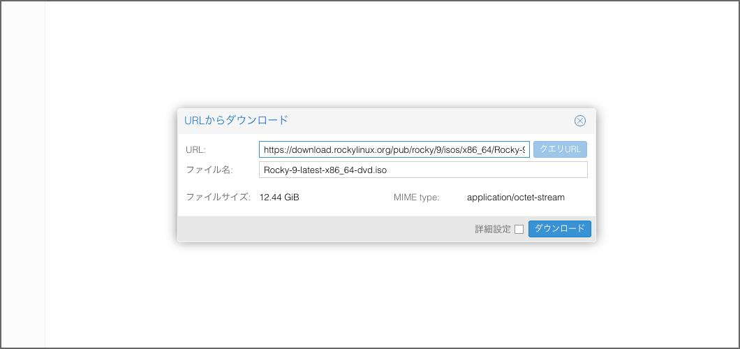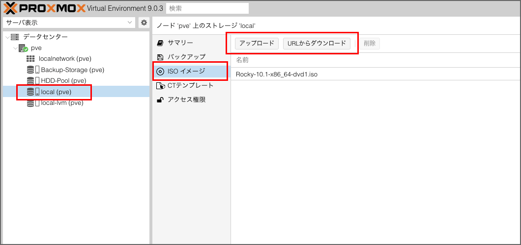手元のPCにISOファイルがない場合は、Proxmoxの 「URLからダウンロード」 機能を使うと効率的です。