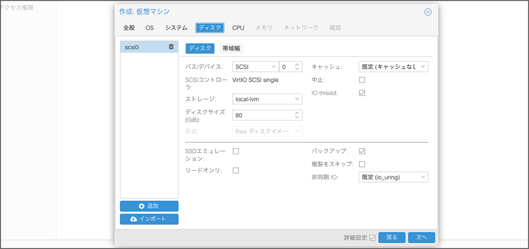 • ディスクサイズ: 任意のサイズ(例:80GB