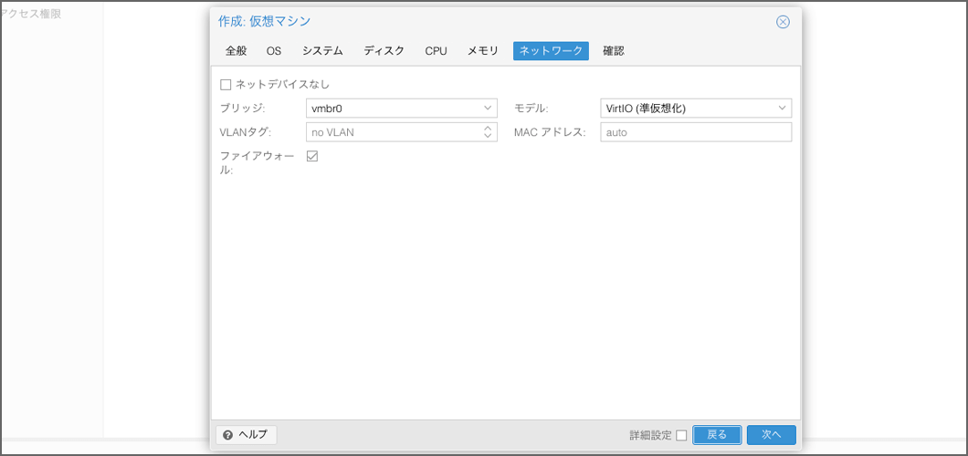 • ブリッジモード(vmbr0)となり、Proxmoxと同じネットワーク帯のIPが割り当てられます。