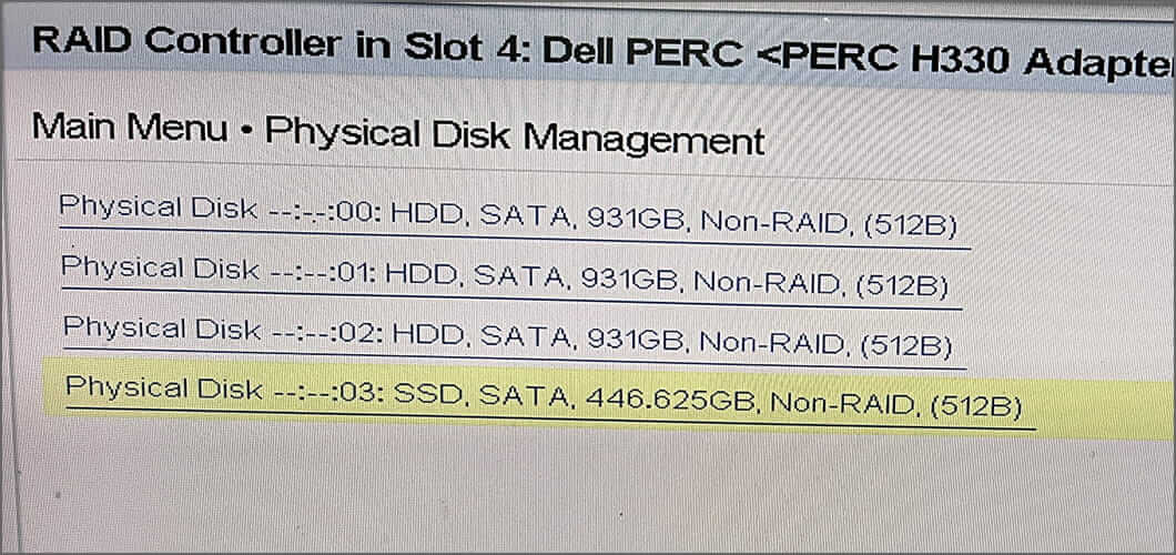RAIDコントローラーの設定画面(Physical Disk Management)を開き、全てのディスクをNon-RAIDにします。これをすると認識されます 。
