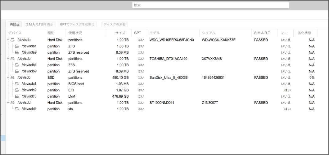 問題なく全てのディスク(1TBのHDDたちやSSD)を認識しています 。