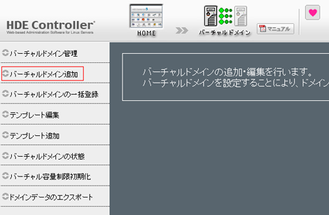 バーチャルドメインをクリックするとバーチャルドメインの管理画面にきます。ここでバーチャルドメインの追加をクリックします