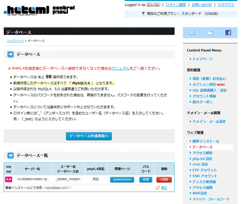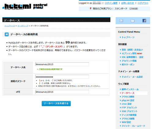 このアンケートシステムはデータベースを使うため、事前にヘテムルのMySQLでデータベースの作成をします。