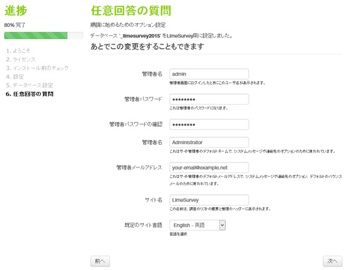 任意の質問に回答していきます。メールアドレスとサイト名を自分のにします。