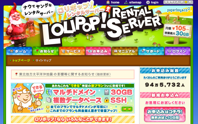 格安のレンタルサーバーとしては有名なレンタルサーバーです。マルチドメインに対応していて最大容量も30GB等あるみたいです。初心者のかたや初めて借りる方にもお勧めです。