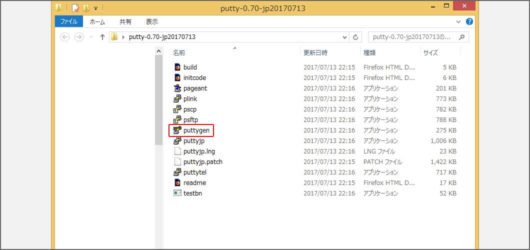 今回は実験なので、デスクトップに保存しておいてputty-0.70-jp20170713の中にkeyフォルダを作り、そこに秘密鍵をいれますputtyなので秘密鍵はppkのほうを使います