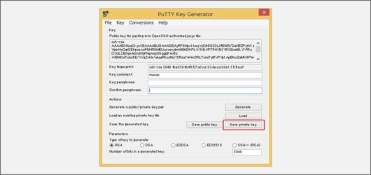 赤枠のSave private keyを押します。ファイル名は適当でOKです拡張子「.ppk」というのがつきます。ここではmaca.ppkとしました。今回作ったのは秘密鍵の元となるファイルです