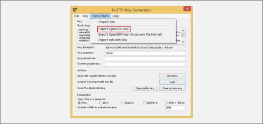 メニューの「Conversions」→「Export OpenSSH key」で秘密鍵を作成します。ファイル名はmacan_id_rsaとしました