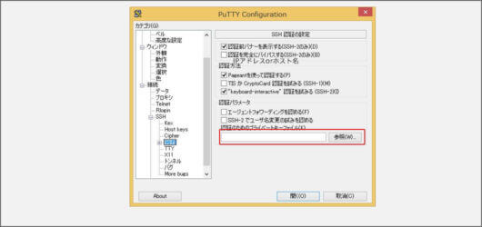接続 > SSH > 認証を出し、認証の項目でキーファイルを登録します